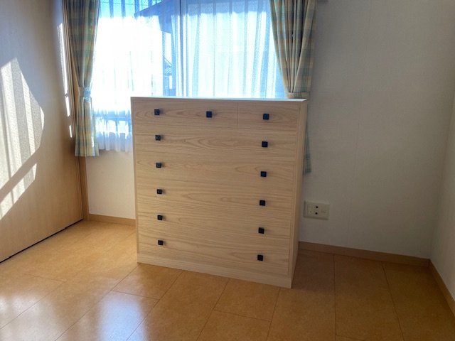 その後は東名を走り、神奈川県平塚市まで。素敵なご自宅のお部屋に別注の桐チェストをお届けさせていただきました。キリモニシリーズの取手をウォールナットに変更です。引出しを仕切る「ツカ」の部分のウォールナットを離して取り付けました。これも可愛くていいですね。K様、ありがとうございました。