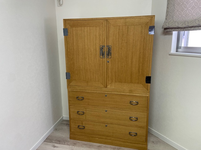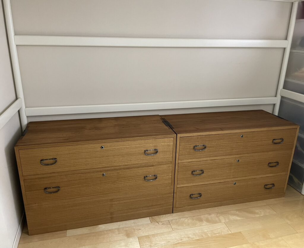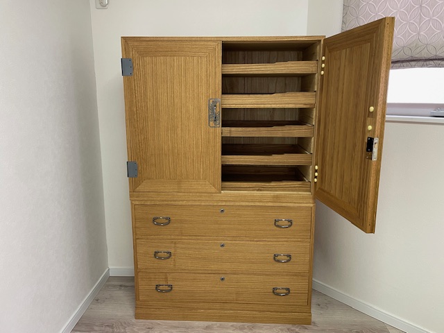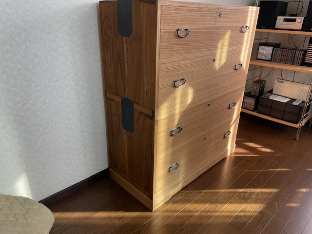 一軒目は、町田市のS様。二つ重ねの桐たんすの上台と下台の高さを合わせて再生致しました。お部屋にもちょうどぴったり収まりました。ありがとうございました。