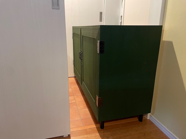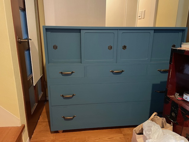 その後は、世田谷区まで。マンションに大きな三つ重ねの桐たんすを、上台と下台を重ねてブルーに仕上げ、ブナの4本脚を取り付けて再生。