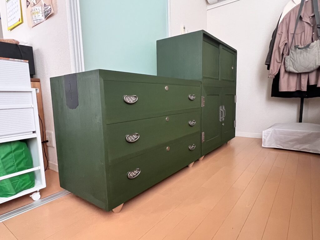 その後は、日野市まで伺い、修理のご依頼を頂いたお客様宅で、桐たんすのお引取り。そして、府中市へ向かいます。府中市では、モスグリーンに仕上げた再生たんすをお届けさせていただきました。W様、ありがとうございました。
