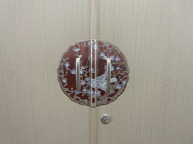 金具は、「梅に鶯金銀嵐」 渋くもあり華やかさもある、私の好きな金具です。
